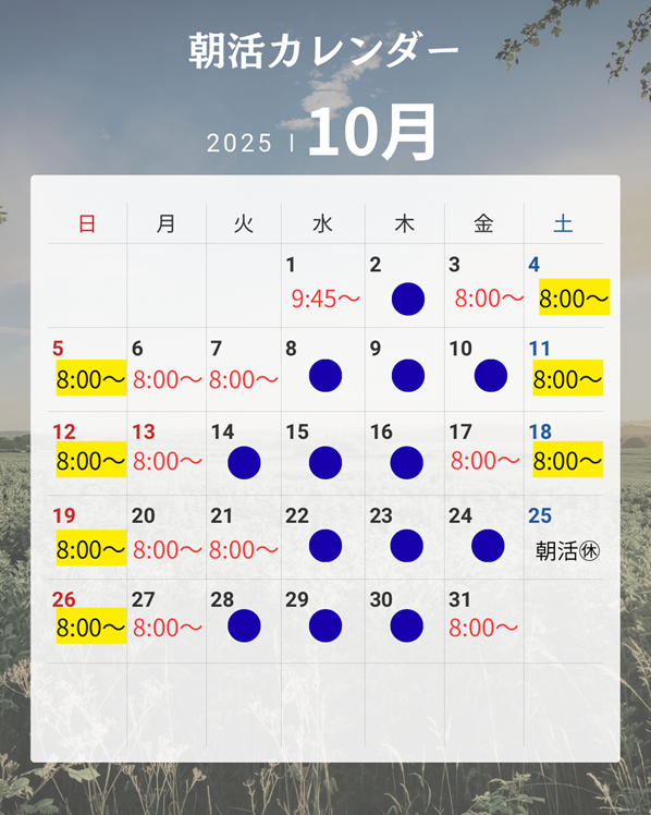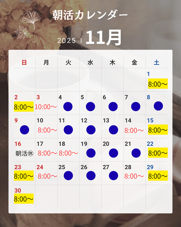 ・空白の日…朝活が未定です。近日中にご案内いたします。通常の11:00~のご予約は可能です。